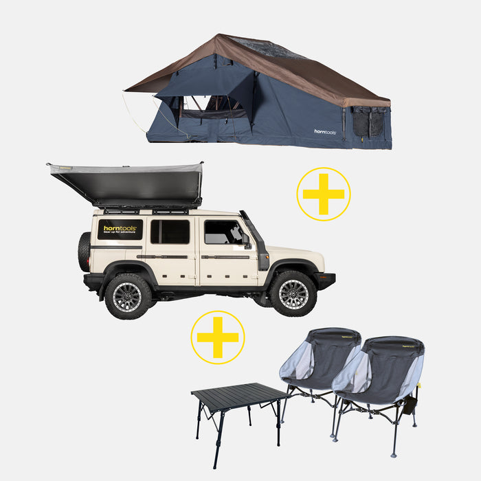 Mit dem Elements Ocean Bundle Gold bekommst du unser robustes Elements Ocean Gen 2 Dachzelt (in verschiedenen Größen erhältlich), die Straight Markise sowie das horntools Campingmöbel-Set mit zwei Stühlen und einem Tisch – als perfekt abgestimmtes Komplettpaket zum Vorteilspreis.